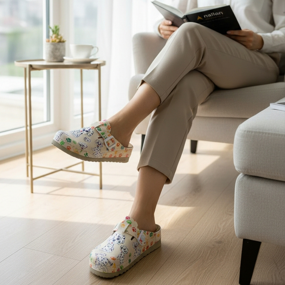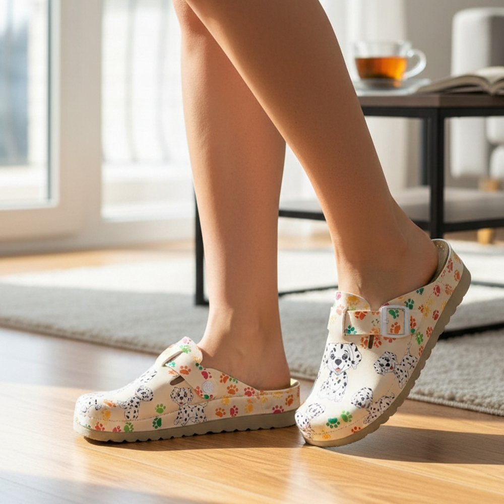 Nallan anatomske natikače sa motivom psa i kožnim uloškom – udobne ženske klompe