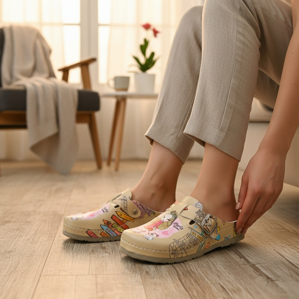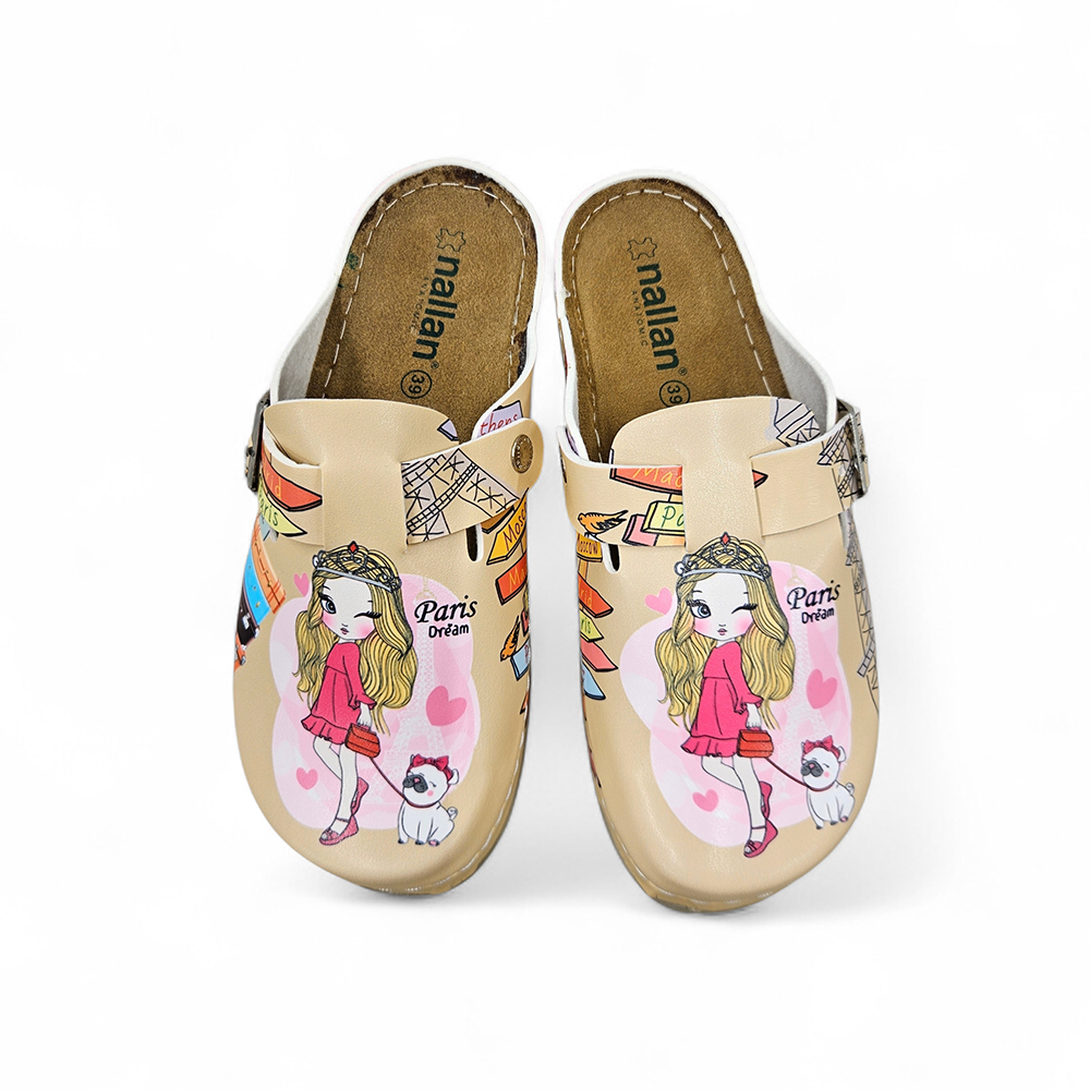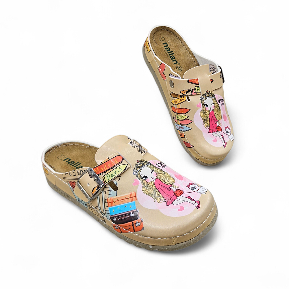 Udobne anatomske natikače Nallan s kožnom tabanicom i atraktivnim Paris uzorkom. Savršen spoj stila i cjelodnevne udobnosti.