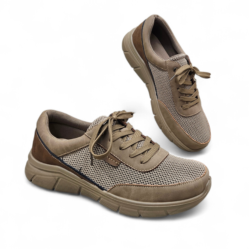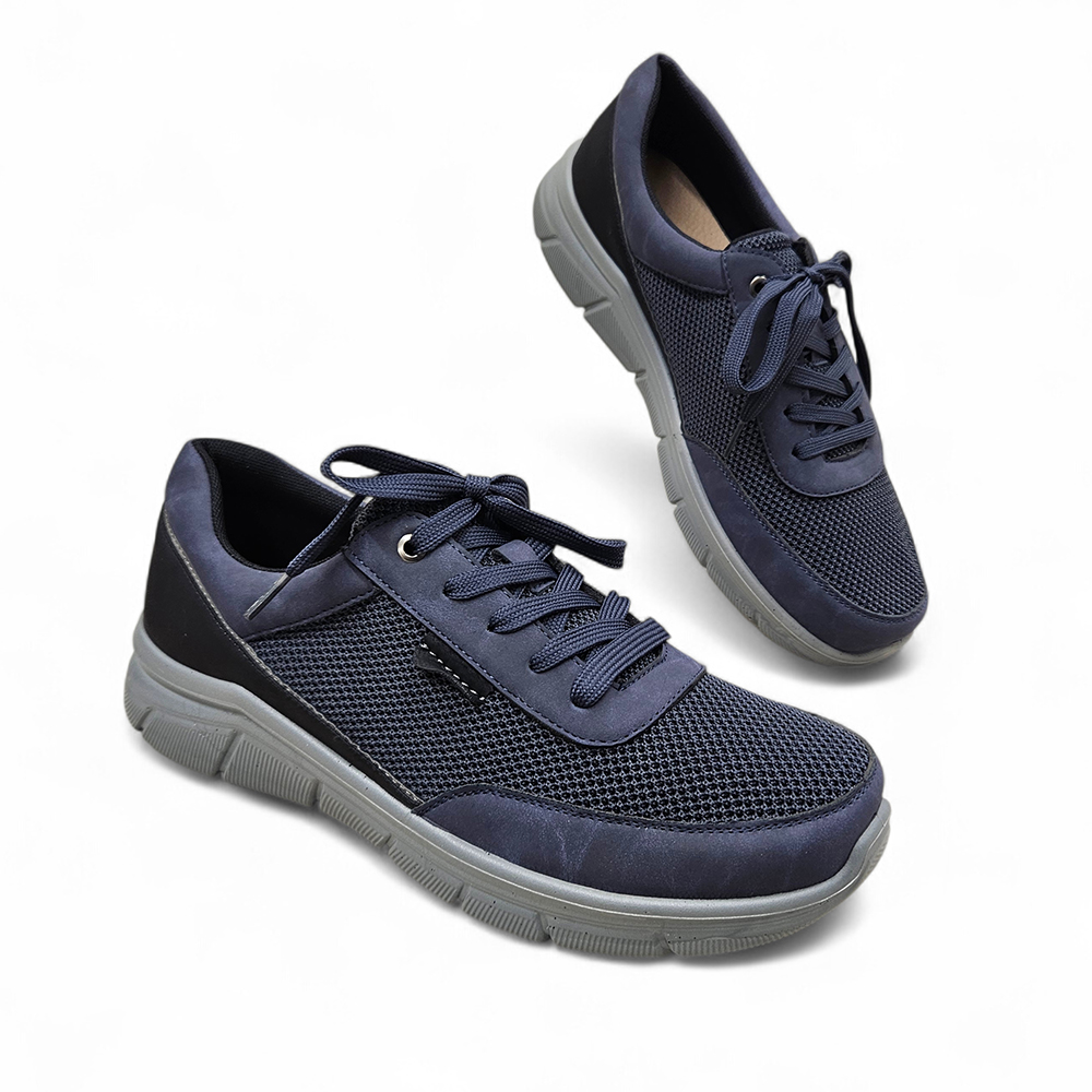 Lagane muške prozračne cipele na vezanje od mesh materijala s kožnom tabanicom za maksimalnu udobnost. Dostupne u tamno bež, plavoj i sivoj boji.