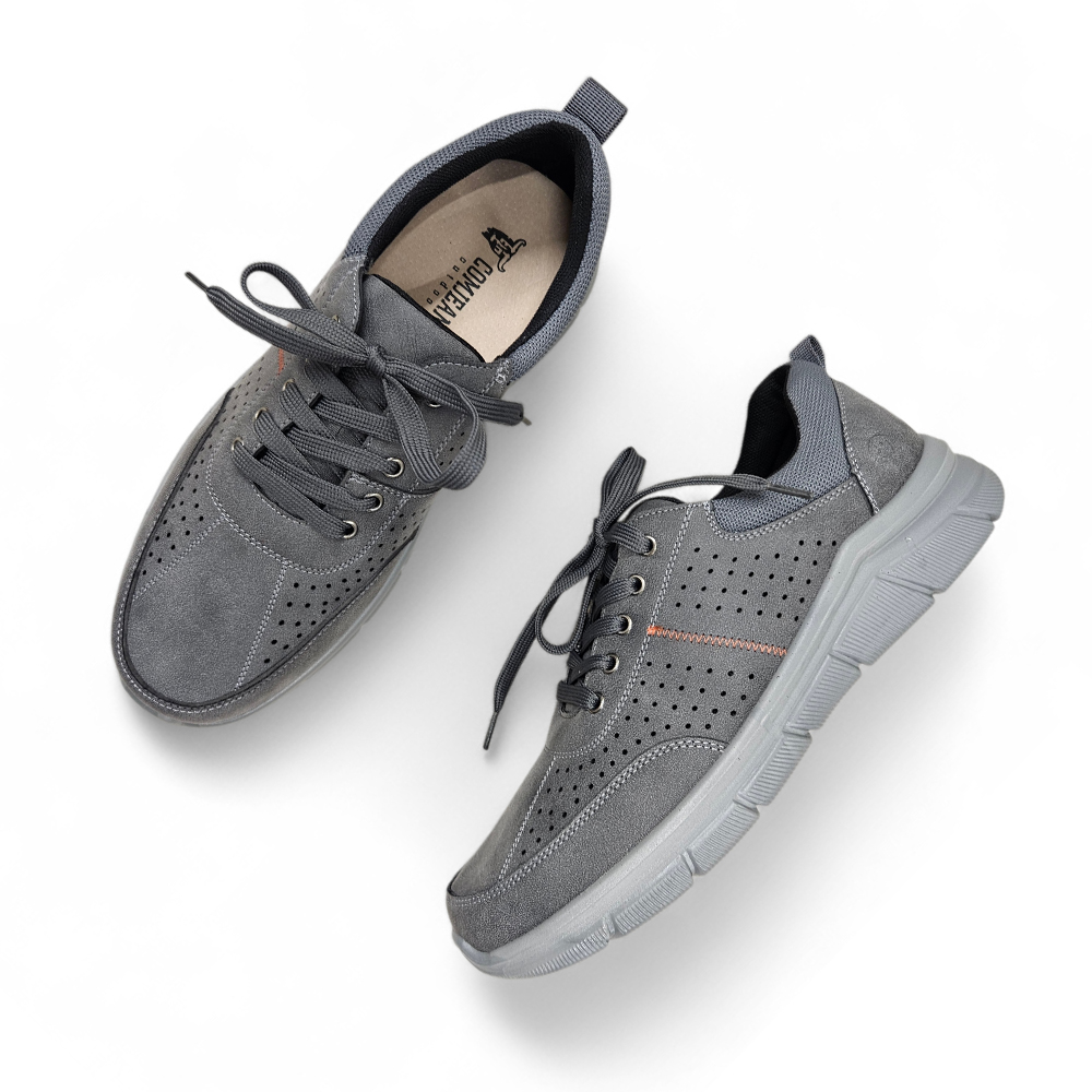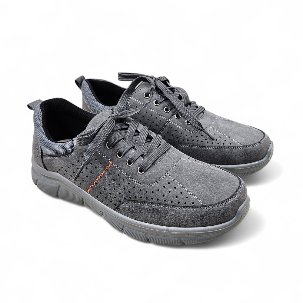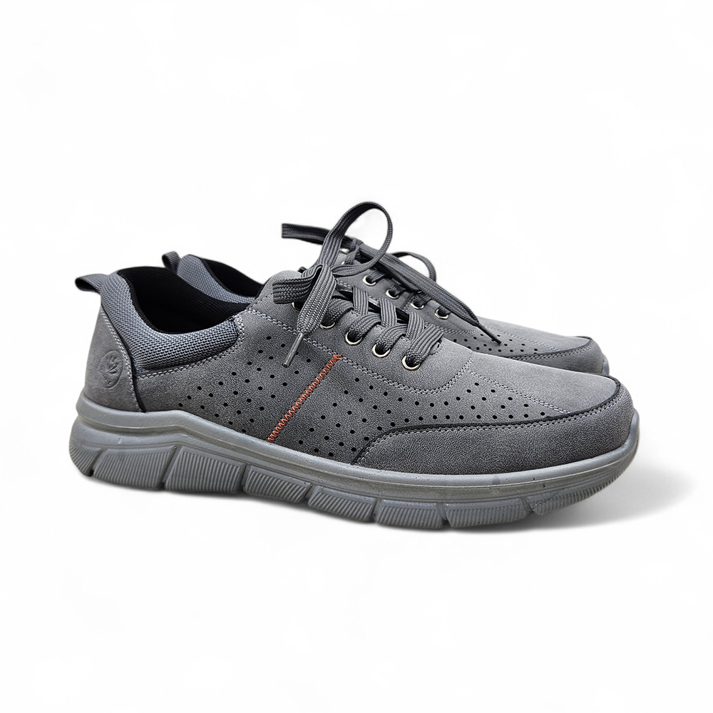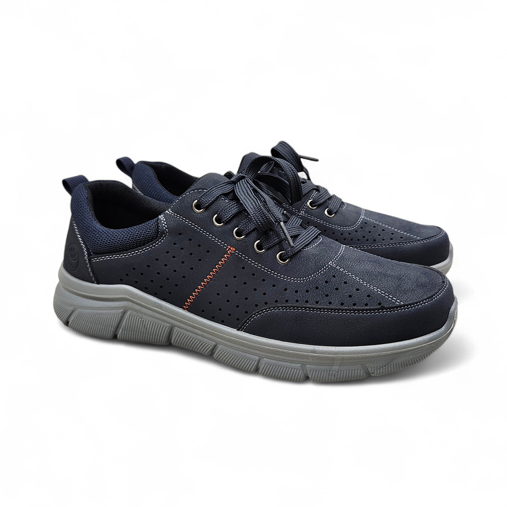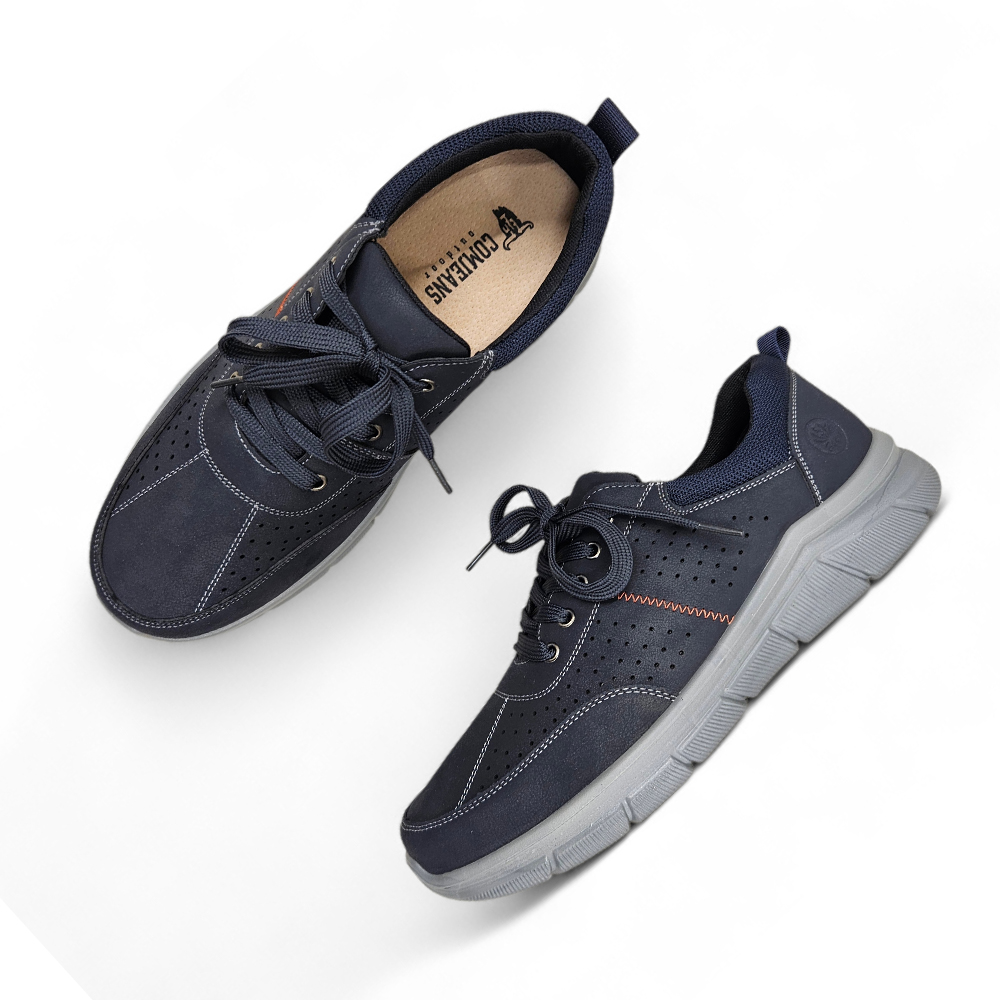 Muške udobne cipele od mekanog materijala s kožnom tabanicom za maksimalnu udobnost. Dostupne u plavoj i sivoj boji – sa dekorativnim perforacijama.
