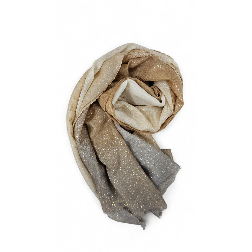 Lagana i elegantna pašmina šal u bež i sivoj boji. Polutransparentan materijal savršen za prijelazna razdoblja i sofisticiran izgled