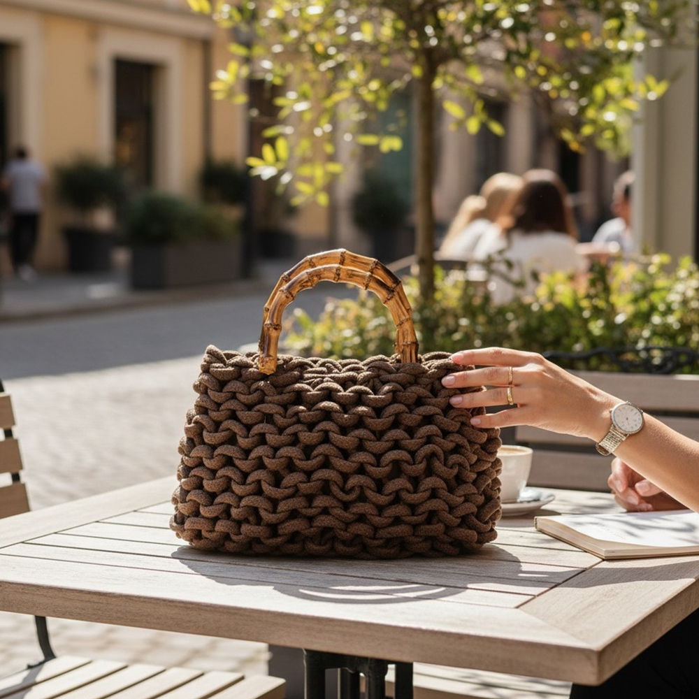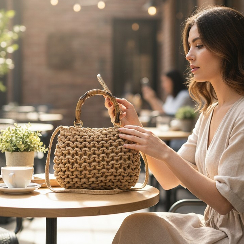 Ova sofisticirana pletena ženska torba s bambus ručkom savršen je izbor za ljubiteljice prirodnog i bezvremenskog stila. Inspirirana popularnim boho i natural dizajnom, torba donosi toplinu prirodnih materijala u svakodnevne modne kombinacije.