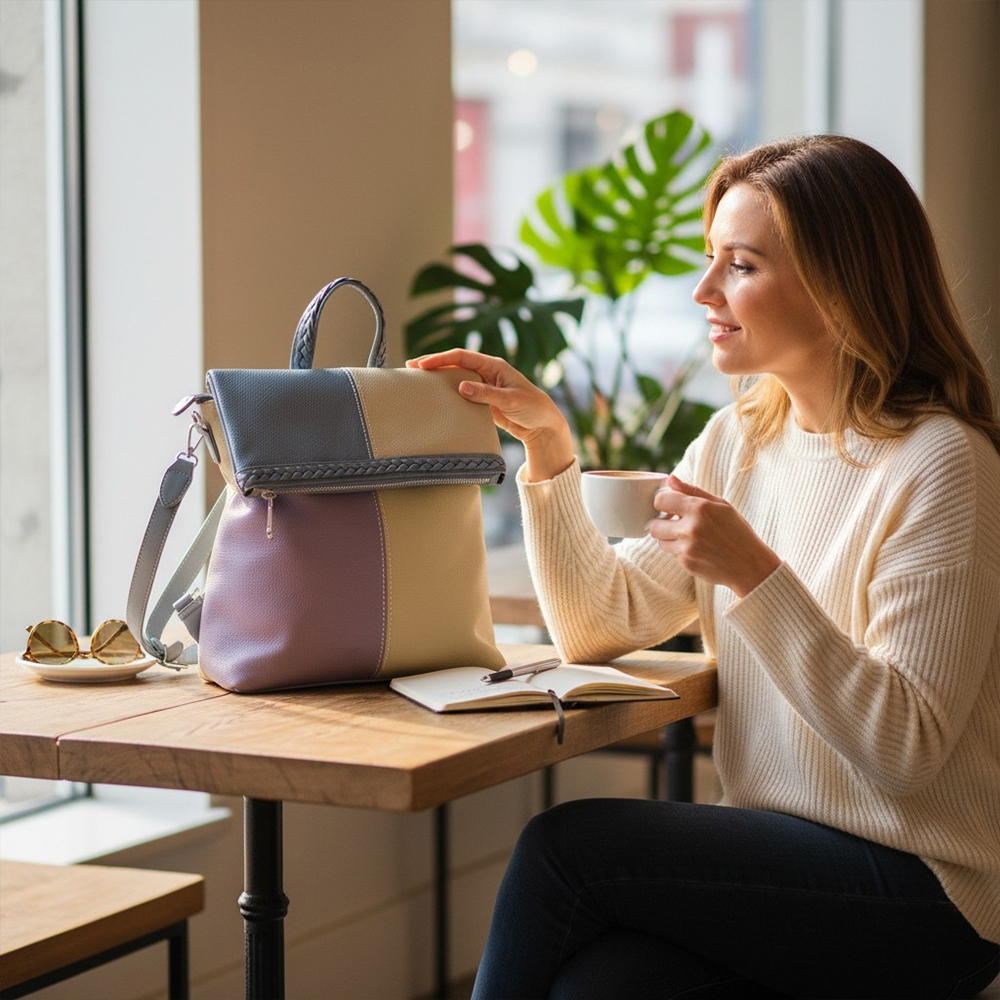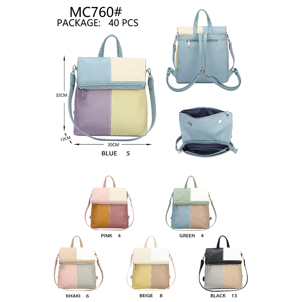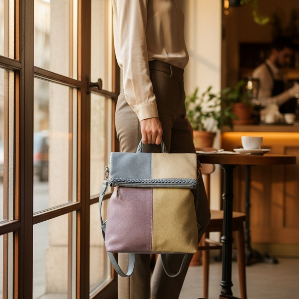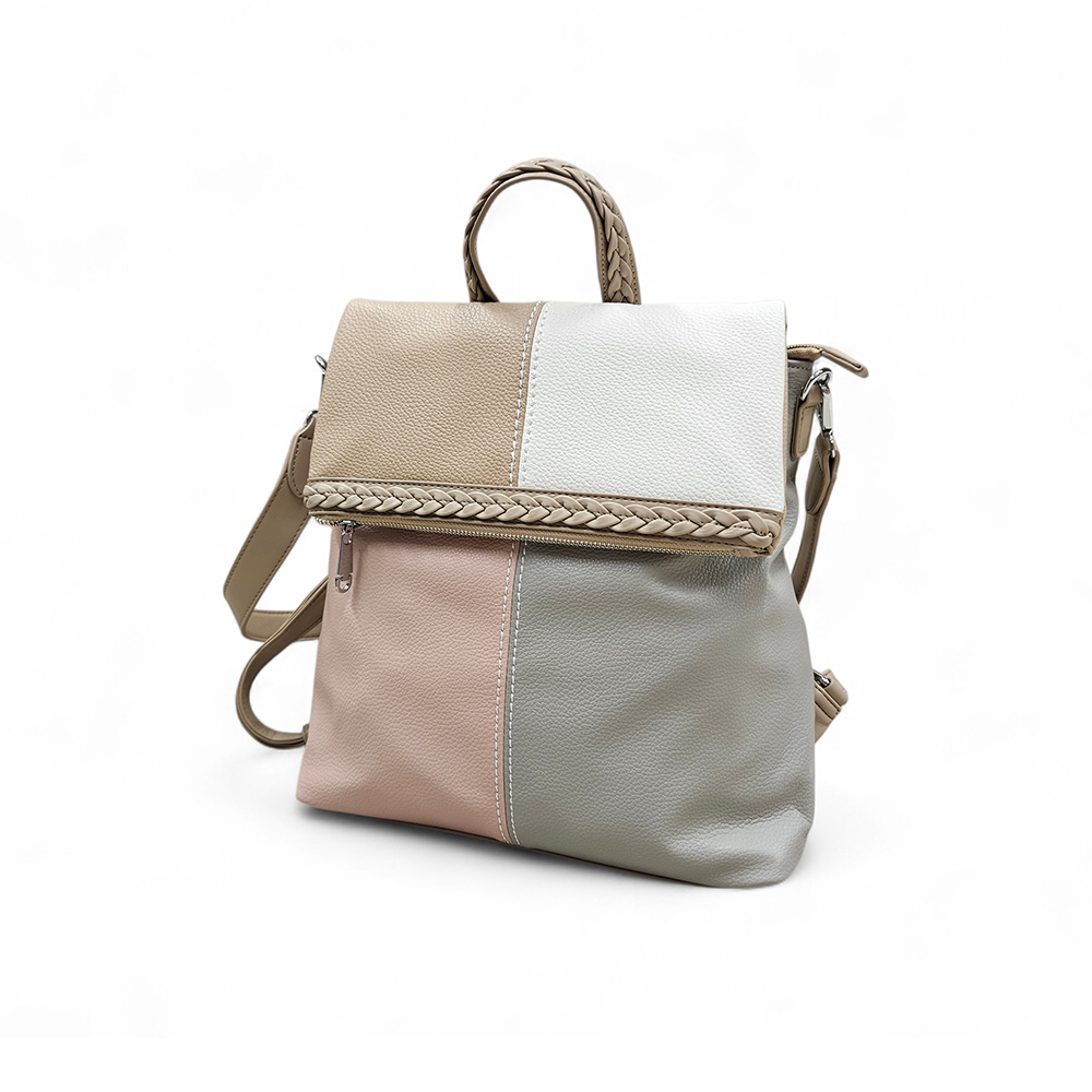 Ruksak srednje veličine sa ukrasnim pletenim detaljima četverobojnog gornjišta u kocka oblicima sa dodatnim manjim remenom funkcijom torbe!