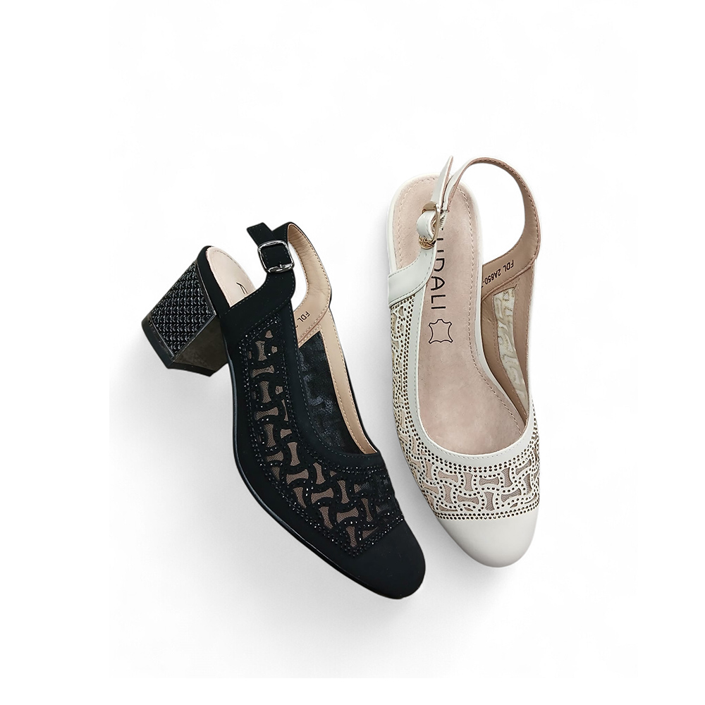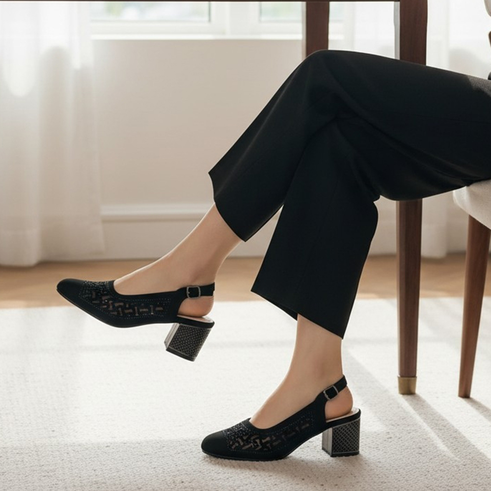 Gornjište od velura ukrašeno je dekorativnim perforiranim uzorkom (diskretna mrežasta struktura) koji daje obući prozračnost i vizualnu lakoću. Otvorena peta s remenom omogućuje bolju ventilaciju, dok stabilna peta srednje visine pruža sigurnost i ravnotežu pri hodu.