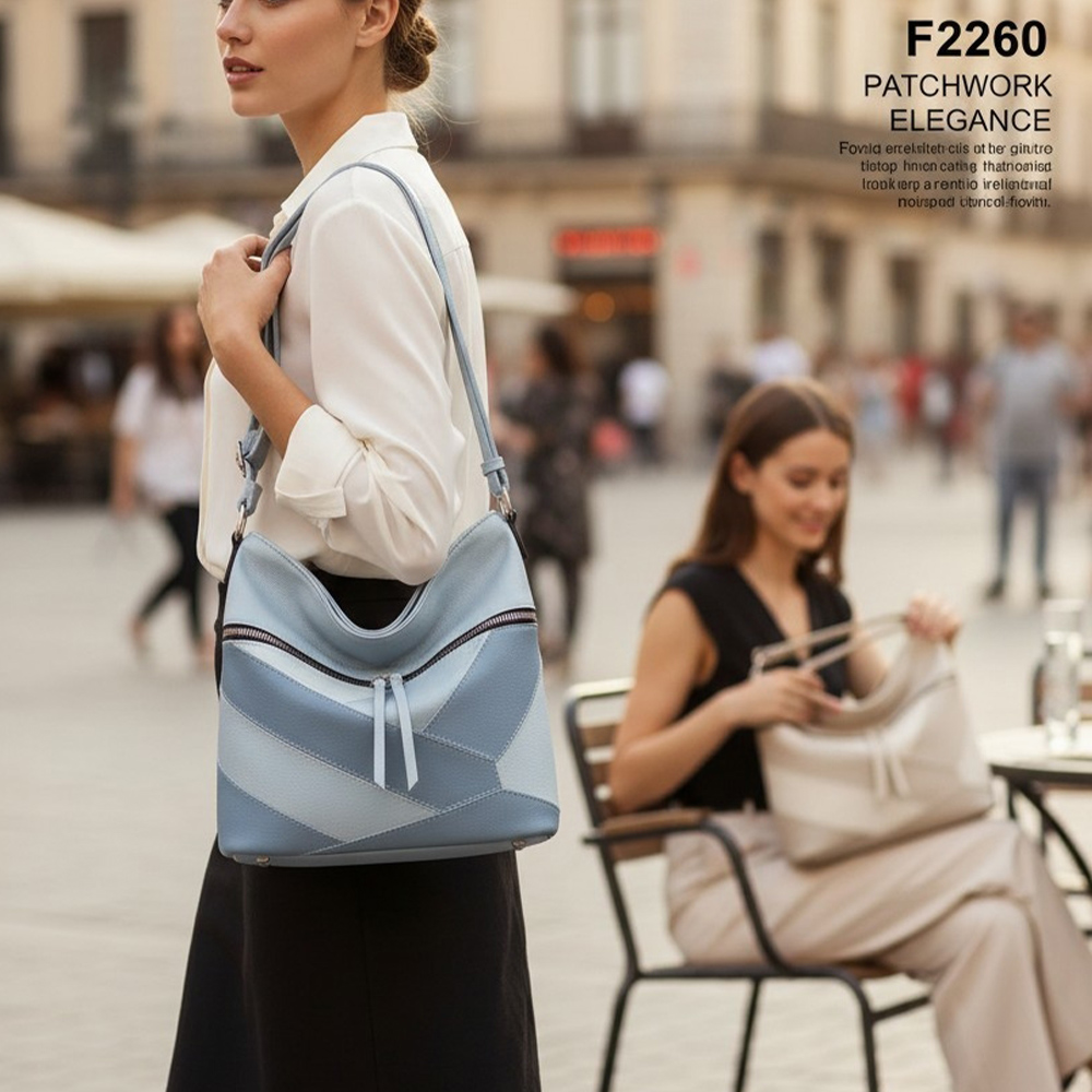 Ženska torba preko ramena s patchwork dizajnom u plavim tonovima, nošena uz elegantan gradski outfit u urbanom okruženju.