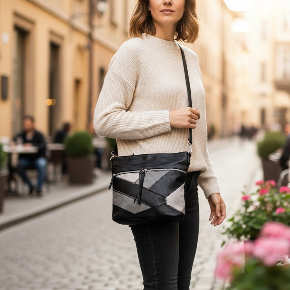 Ova moderna ženska torba preko ramena ističe se jedinstvenim patchwork dizajnom koji donosi dinamiku i suvremeni izgled svakom outfitu. Pažljivo kombinirane boje i geometrijski uzorci čine je savršenim modnim dodatkom za žene koje žele nešto drugačije, ali i elegantno.