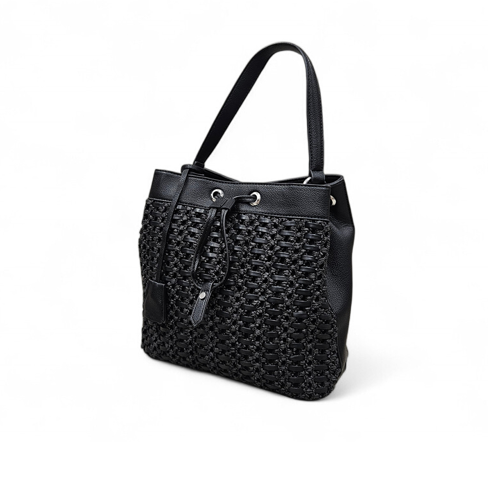 Crna ženska torba s pletenim uzorkom i vezicom na bijeloj pozadini