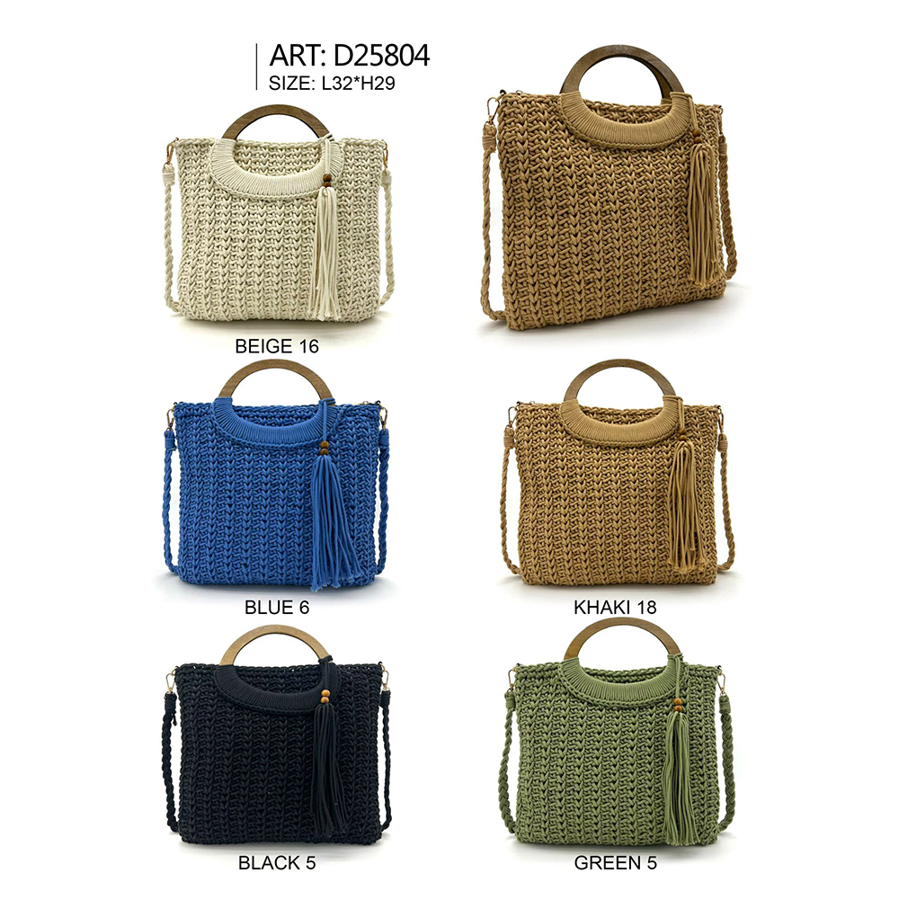 Ova elegantna ženska pletena torbica ističe se jedinstvenim dizajnom s okruglim drvenim ručkama i dekorativnom resicom, što joj daje prirodan i sofisticiran izgled. Izrađena od kvalitetnog umjetnog materijala i pletiva, savršeno kombinira stil i praktičnost.