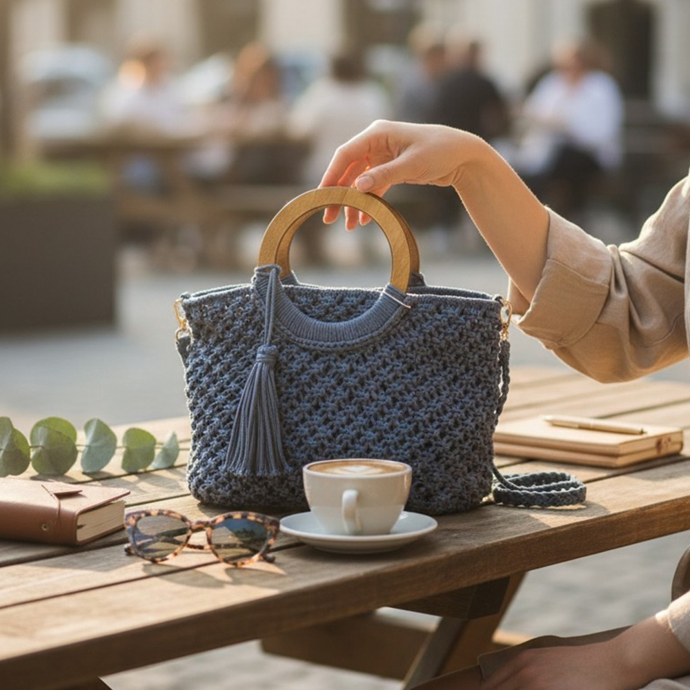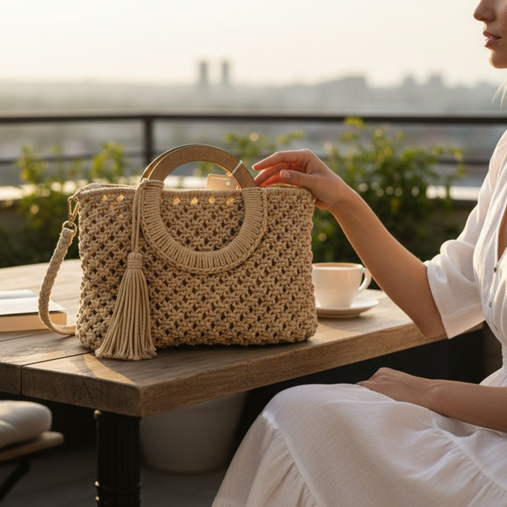 Ženska pletena torbica s drvenim ručkama i resicom na stolu na terasi