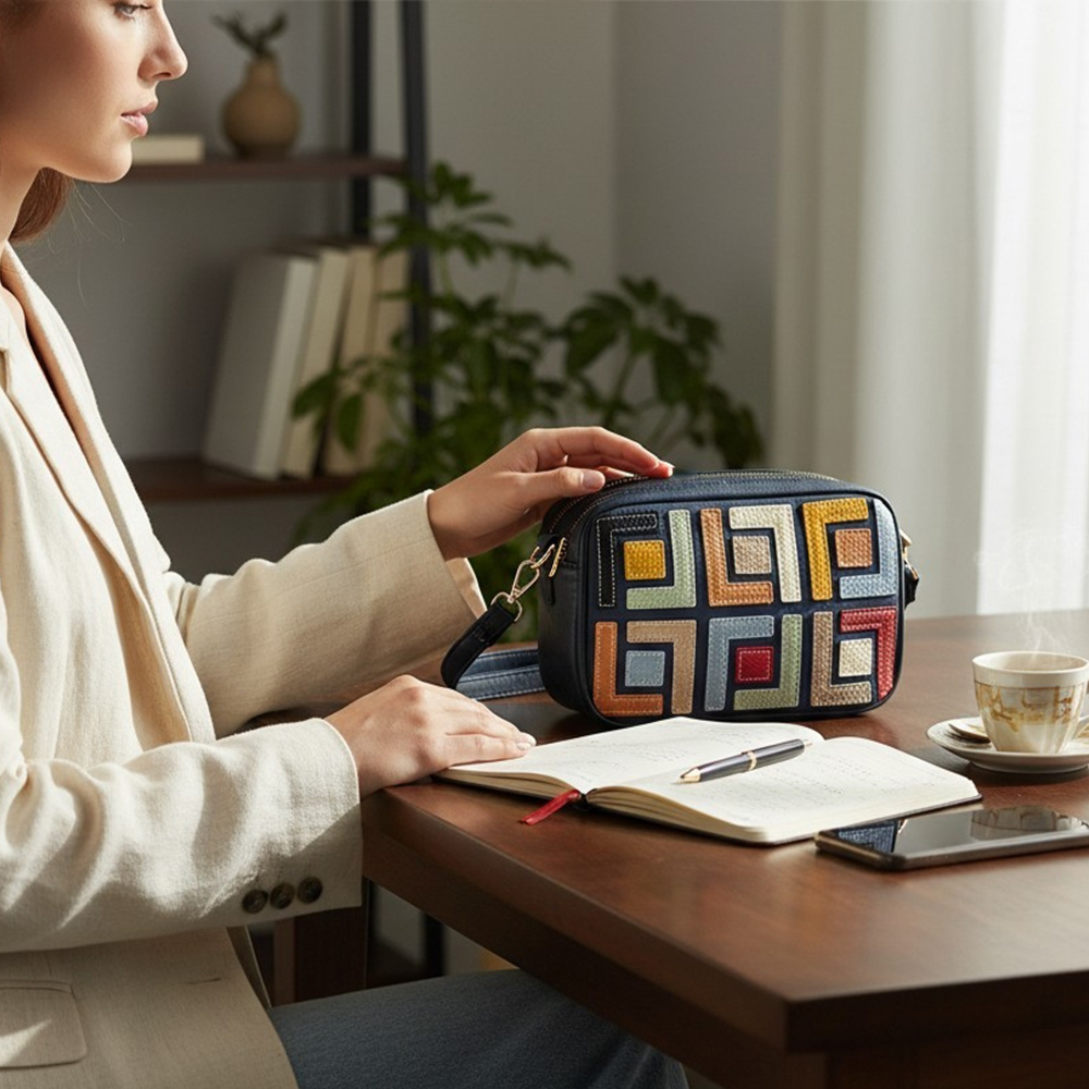 Ova moderna ženska torba s geometrijskim uzorkom savršen je spoj funkcionalnosti i urbanog stila. Inspirirana minimalističkim i retro dizajnom, torba se ističe zanimljivim kombinacijama boja i uzoraka koji privlače pažnju, ali se lako uklapaju u svakodnevne outfite.