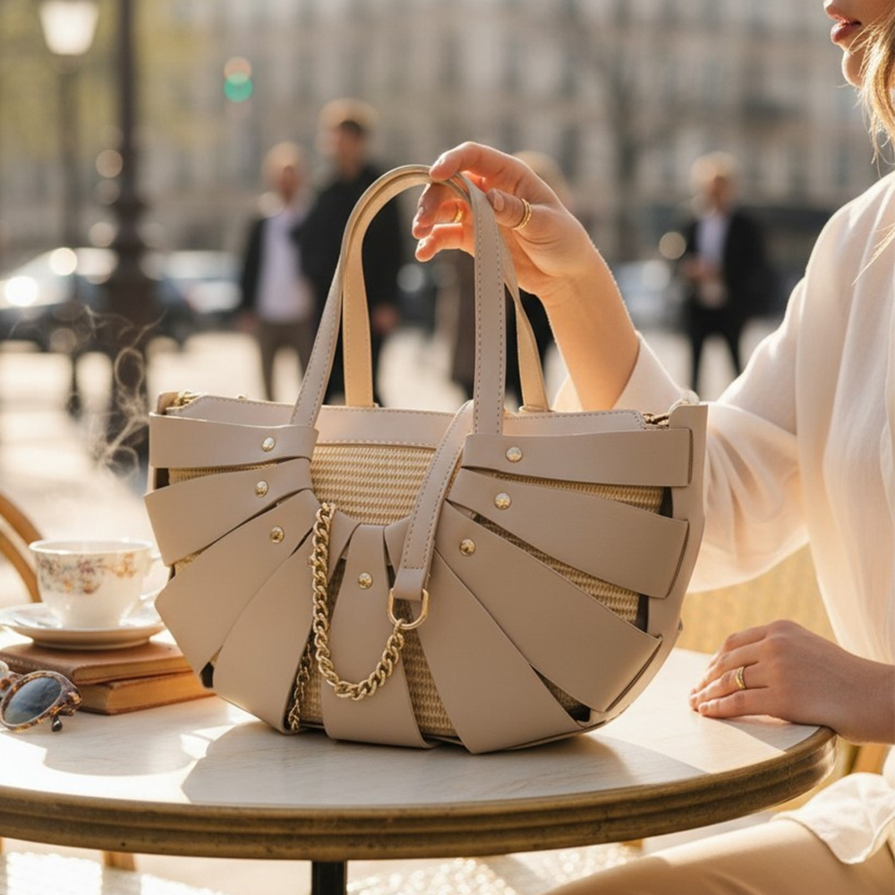 Ženska pletena torbica s ručkama na stolu u gradskom okruženju