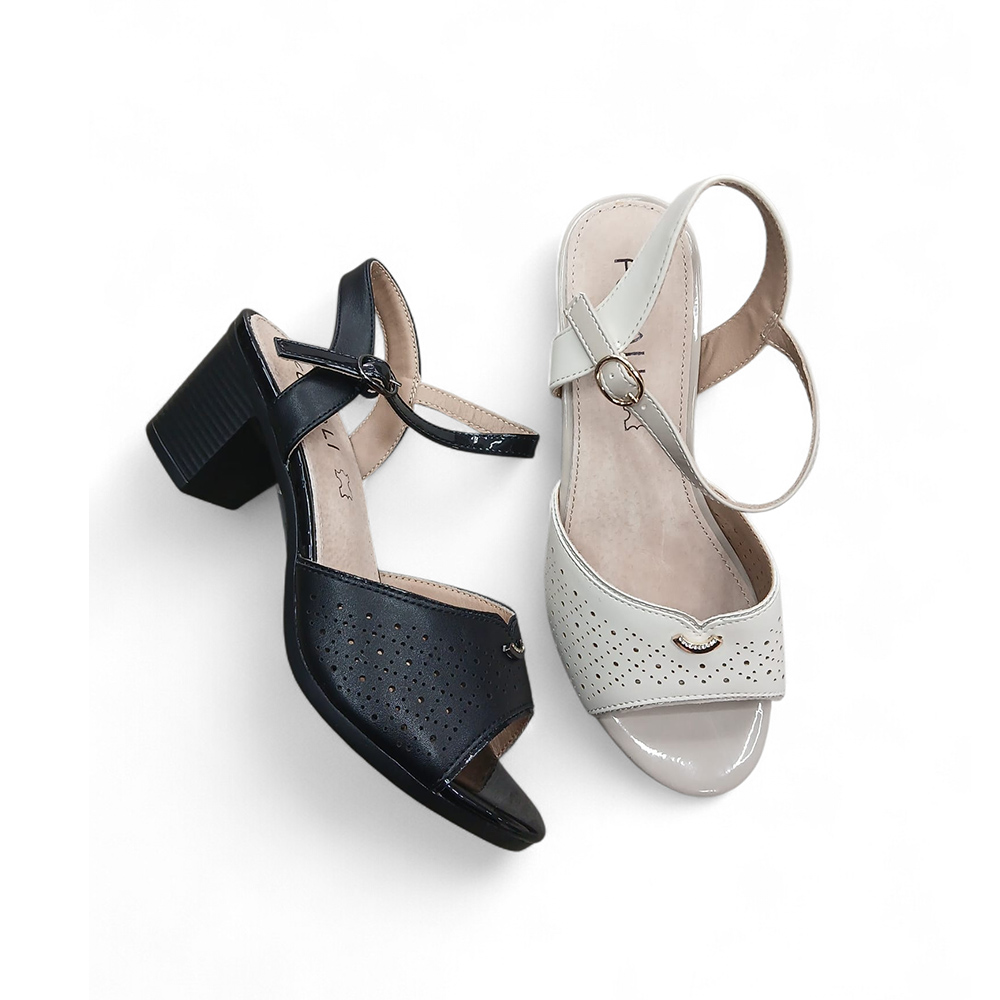 Širi kroj omogućuje prirodno pristajanje stopalu, bez osjećaja stezanja, dok perforirani detalji na gornjištu pružaju dodatnu prozračnost i svježinu. Stabilna blok peta srednje visine osigurava siguran i lagan hod, a remen oko gležnja daje dodatnu potporu.